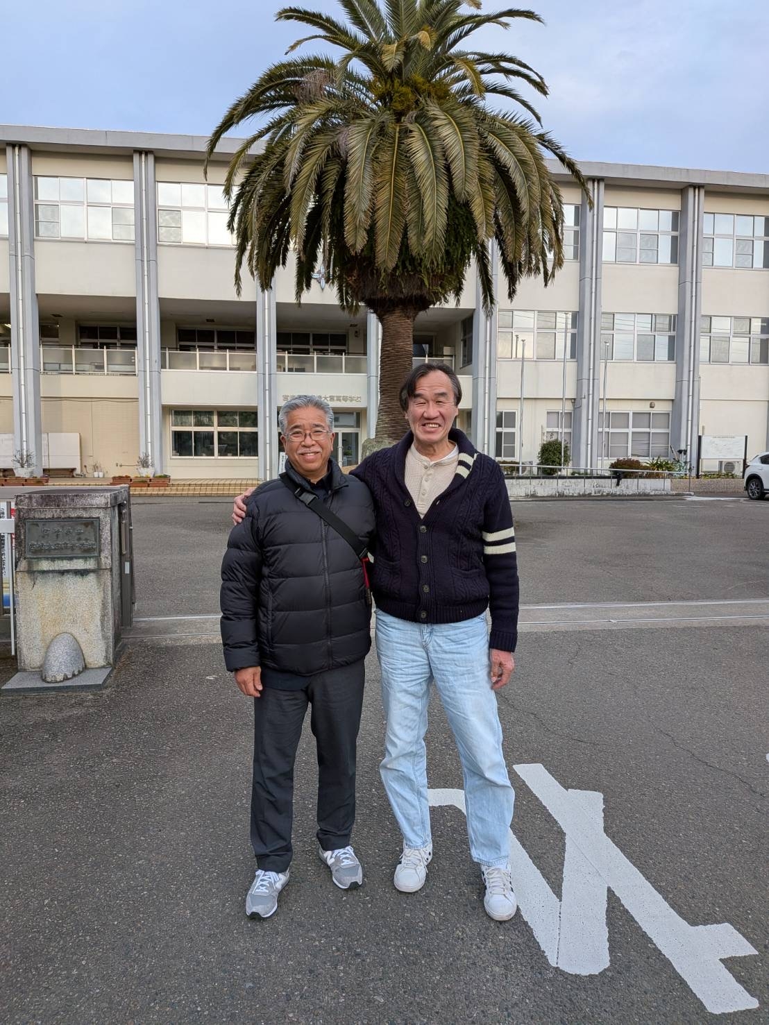 3月8日、東京から帰省した加藤英夫君と母校の前で記念撮影。