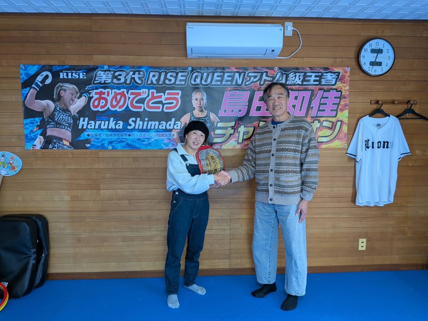 RISEアトム級チャンピオンの知佳がベルトを持って明道館に来てくれました。感激!