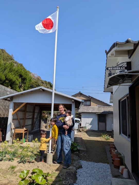 3月20日、風光る春分の日、孫たちと一緒に明道館の横に設置した旗ポールに日の丸を掲げました。